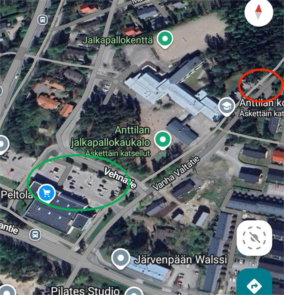 Autoja ei saa jättää Vanhan Valtatien päässä olevalle kääntöpaikalle tai henkilokunnan parkkipaikalle (punaisella merkitty ympyrä).